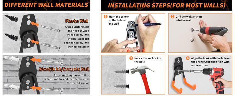 【Easy to Install】Equipped with two types of screws and anchors, the garage storage hooks can be easily installed on various walls with only an electric drill and a screwdriver, keeping everything in order.