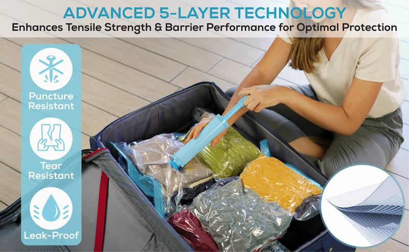 - Convenient Hand Pump Included: Each set of our vacuum packing bags for travel comes with a travel vacuum bags with pump, making it easy to compress your items on the go. Perfect for those who need a quick and efficient packing solution.