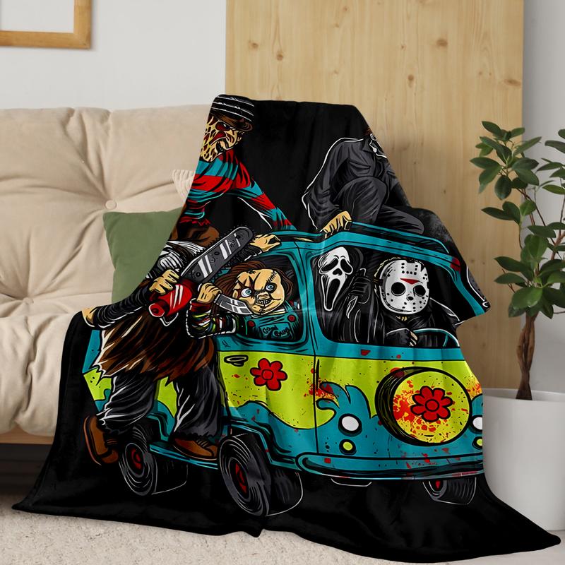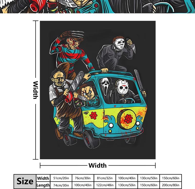 Funny Horror Killer Van Throw Blanket 1 Count for Couch Sofa Bed Use Halloween Blanket Gift for Scary Movie Fans Featuring Classic Villains Driving Mystery Van in Cartoon Style with Chainsaws Knives and Bloody Chaos Elements