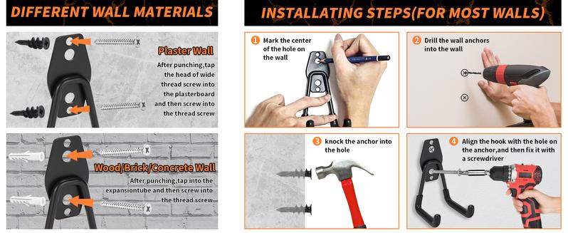Each set includes screws and both drywall and concrete anchors for flexible mounting options. Just drill and install—these garage storage hooks stay securely in place on any wall surface.