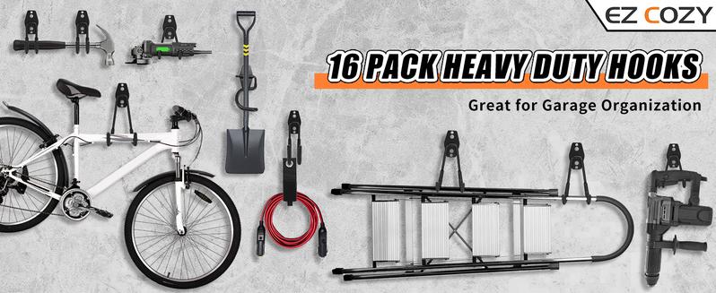 Steel Garage Storage Hooks 16 Pack Anti-Slip Coating Heavy Duty Wall Mount Assorted Sizes Hooks for Hanging Bike Ladder Outdoor Garden Tools
